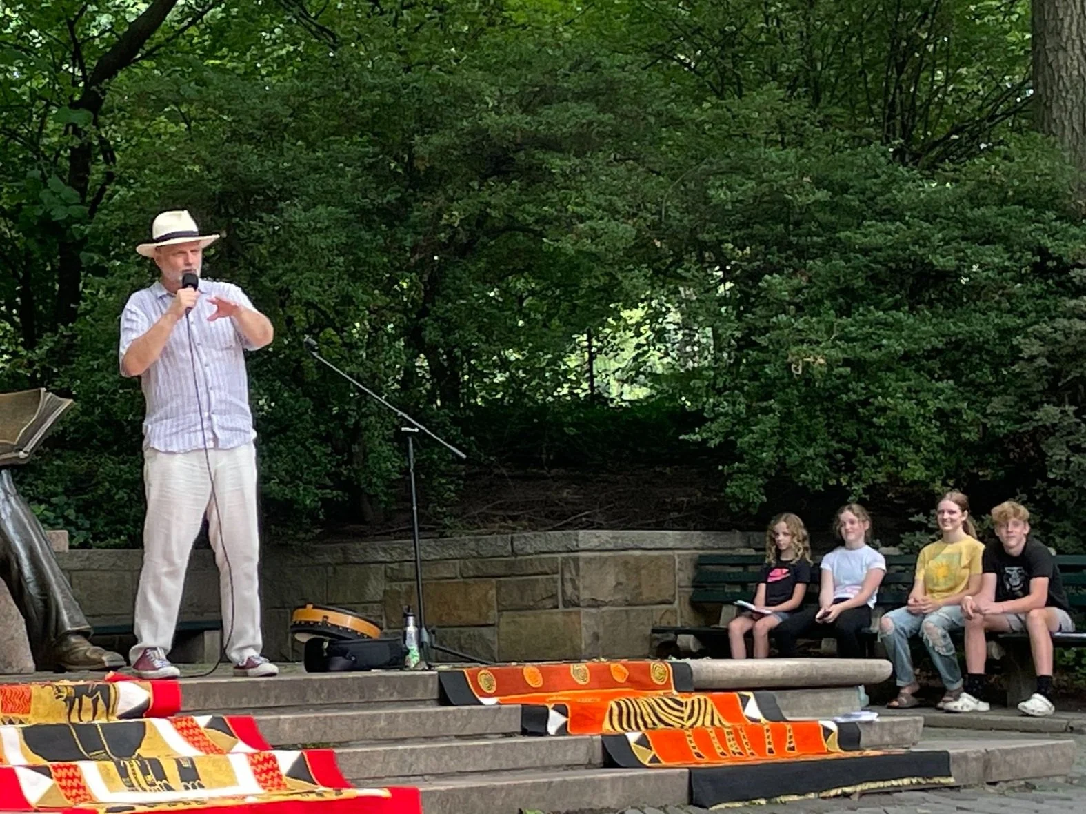 Simon telling stories at the Hans Christian Andersen Statue, Central Park, NYC.
